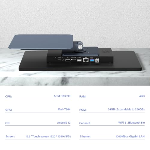 Especificaciones: Computadoras de escritorio todo en uno de 15.6 pulgadas, FHD 180 ° pantalla táctil ajustable Android 12 RK3399 4GB RAM/64GB ROM, HDMI 2.0 WiFi Bluetooth 4.2 para oficina/automatización/quiosco/bar/almacén