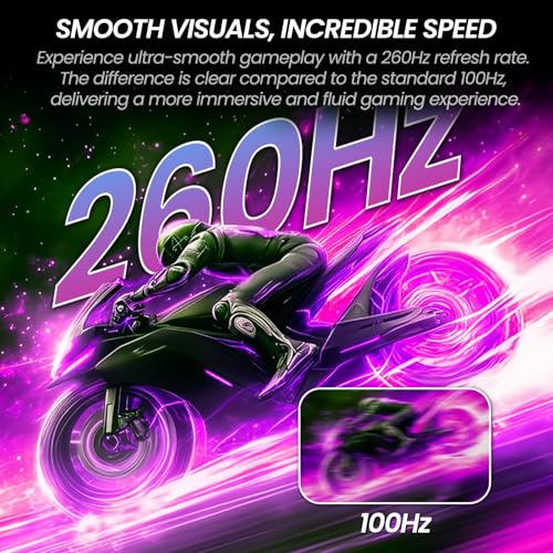 Reveal curvo para juegos de 260 HZ: supera a tus oponentes con este Reveal de juegos de 27 pulgadas con una alta frecuencia de actualización de 260 Hz, casi 4 veces más rápido que las pantallas estándar de 60 Hz. Cada fotograma se actualiza más rápido para un movimiento más artful, ayudándote a rastrear enemigos y reaccionar al instante. Combinado con AMD FreeSync, elimina el desgarro de l. a. pantalla y el tartamudeo, asegurando un juego fluido y sin interrupciones, perfecto para títulos de FPS y eSports