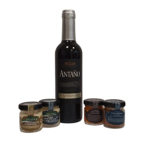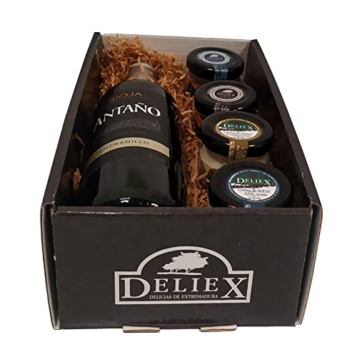 Deliex. Cesta Gourmet con Vino Rioja Antaño de 37,5 cl mediana, 2 patés de Lomo Ibérico 30 g y Paté al Pedro Ximénez 30 g, 2 Cremas de Queso Deliex caja pequeña..