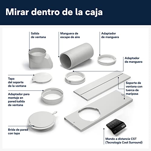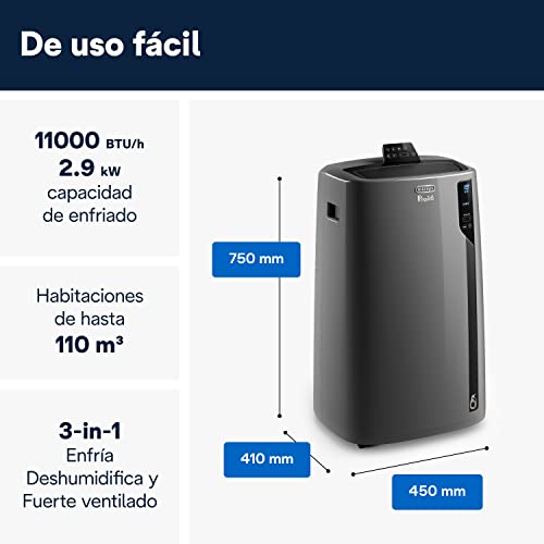 Especificaciones: De’Longhi Pingüino PACEL112 Silent Aire Acondicionado Portátil Silencioso con Tecnología Eco Real Feel y Cool Surround, Función Deshumidificadora, 2.9 kW, 63 dB, Plástico, Negro, Clasa A, hasta 110m3