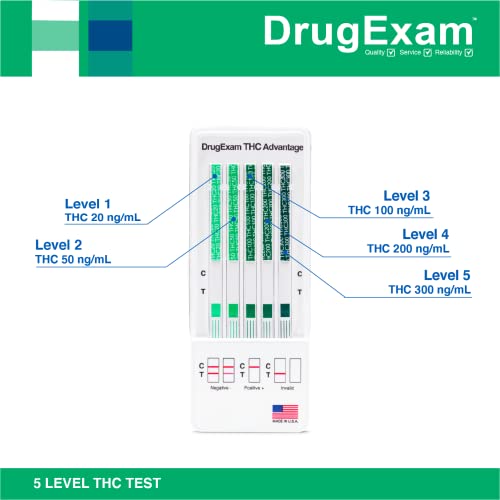 Especificaciones: DrugExam THC Advantage – Kit de prueba de orina de marihuana multinivel fabricado en Estados Unidos. Kit de prueba de drogas altamente sensible THC de 5 niveles. Detecta a 20 ng/mL, 50 ng/mL, 100