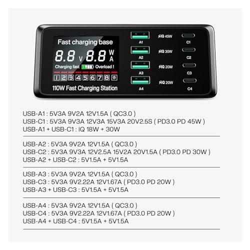 USB-A1/A2/A3/A4: 5V3A 9V2A 12V1.5A (4 puertos de carga rápida QC3.0)