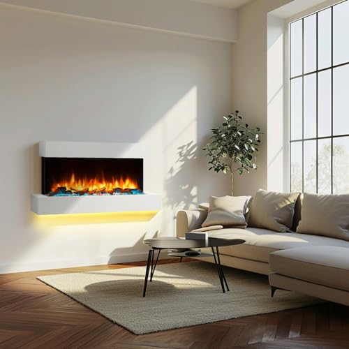 Endeavour Fires Chimenea Eléctrica de Pared Runswick 110cm/43 1&2kW, con Control Remoto Programable de 7 Días y Repisa y Zócalo en Blanco