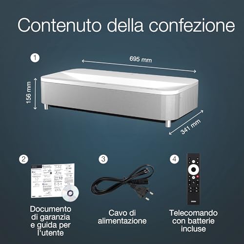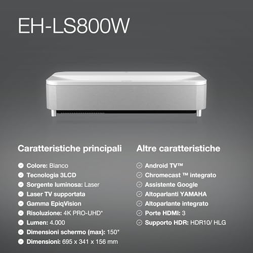 Especificaciones: Epson EH-LS800W – Proyector láser Pro-UHD 4K 16:9, óptica Ultra Corta EpiqVision, Smart Android TV, 4000 lúmenes, Bluetooth/HDMI/USB/WLAN, Chromecast, sorround 3D Yamaha, Proyección máx. 150″ Blanco