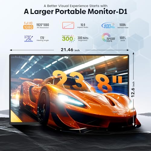 [Visuales de grado profesional] Equipado con un panel IPS que ofrece un brillo de 300 cd/m² y una gama de colores NTSC del 90 % y una frecuencia de actualización de 100 Hz, el extensor de pantalla de computadora portátil de 23.8 pulgadas y el monitor portátil grande garantizan una resolución nítida de 1080P con tiempo de respuesta de 2 ms. El revestimiento antideslumbrante y el soporte HDR proporcionan una visualización óptima en diversas condiciones de iluminación, mientras que los ángulos anchos de 178° mantienen la consistencia del color.
