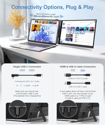 Plug and Play, conexión simple: este monitor portátil para portátiles viene con todos los cables necesarios para una configuración perfecta y sin complicaciones; si tu laptop tiene un puerto tipo C de función completa (etiquetado como Thunderbolt 3.0/4.0, compatible con DP o salida de video), puedes conectarlo rápidamente con solo un cable USB-C a USB-C. Si tu laptop no tiene un puerto tipo C completo, puedes utilizar fácilmente cable USB-A y cable HDMI para conectarlo en el mismo tiempo; si su La pantalla extensora tiene cualquier problema de visualización, póngase en contacto con nuestro equipo posventa para resolverlo por ust