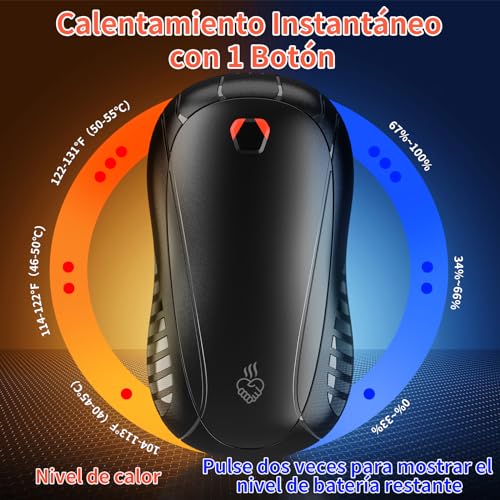 Temperatura Controlable: Calienta manos con interruptor de calefacción de tres velocidades y 3 segundos de calentamiento rápido, puede controlar fácilmente la temperatura de calentamiento. Puede elegir tres temperaturas diferentes: 40-45℃/104-113°F, 45-50℃/114-122 °F, 50-55℃/122-131 °F. Ideal para calentarse las manos en climas fríos.