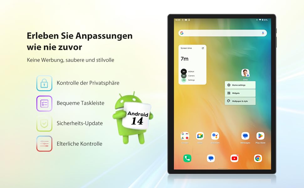 Procesador Octa-Core de alto rendimiento:La tableta FASTWD14 pulgadas está alimentada por un potente Android 14 de bajo consumo con el procesador Octa Core T616 de 2.0 Ghz. El control sobre los permisos de la aplicación y un código de acceso seguro de seis dígitos te permiten experimentar la tecnología más moderna y una mayor protección de la privacidad. Con el avanzado 12 nm Proceso que equilibra el rendimiento y el consumo de energía, puedes ejecutar grandes juegos, usar varias aplicaciones en múltiples tareas, chatear en pantalla dividida, ver vídeos y mucho más para hacer tu vida más eficiente.