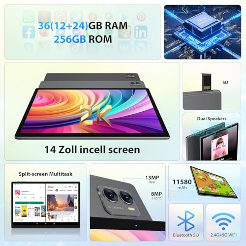 Especificaciones: FASTWD Tablet de 14 pulgadas Android 14 Tablet 5G WiFi/Octa-Core, 36 GB de RAM + 256 GB de ROM (1TB TF), 11580 mAh, Widevide L3, 2000 x 1200HD, GPS, GMS, BT 5.0, gris