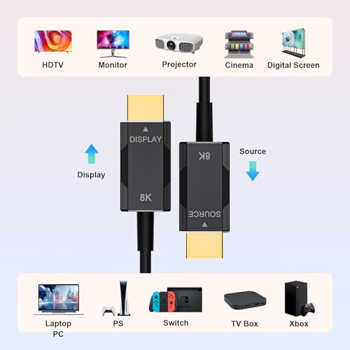Extremista-High Speed & Performance: This Fiber Optic HDMI 2.1 Soga supports blazing-fast 48Gbps aniversario transfer speed, providing seamless performance for 8K at 60Hz, 4K at 120Hz, and high dynamic range (HDR). Unlike traditional copper cables, fiber optic cables maintain a stable signal over longer distances, offering Rector picture and sound quality with minimal loss.