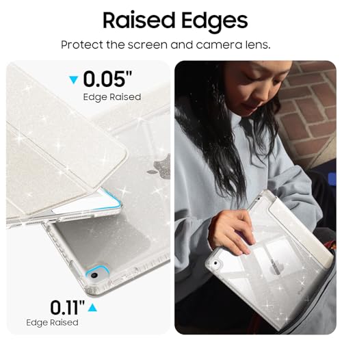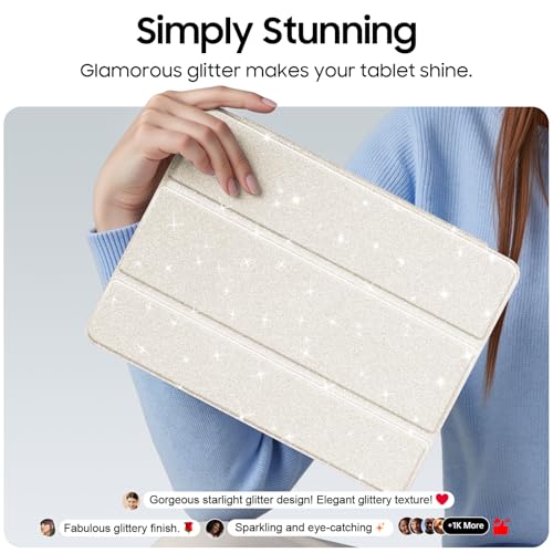 La cubierta trasera rígida con parachoques flexible de TPU protege tu iPad de golpes, caídas e impactos. La parte delantera interior de microfibra suave evita arañazos, mientras que la piel sintética suave resiste el polvo y es fácil de limpiar. Con purpurina de cristal incrustada que nunca se desvanece, asegurando que tu iPad siempre brille intensamente.