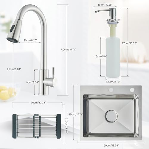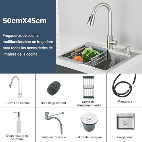 Fregadero de cocina, Fregadero de Cocina Multifuncional con Grifo Extraíble y Dispensador de Jabón, Acabado Cepillado (50 x 45 cm)
