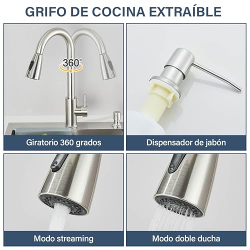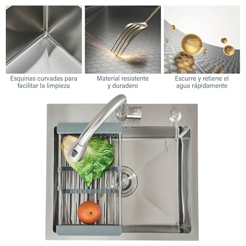 Especificaciones: Fregadero de cocina, Fregadero de Cocina Multifuncional con Grifo Extraíble y Dispensador de Jabón, Acabado Cepillado (50 x 45 cm)