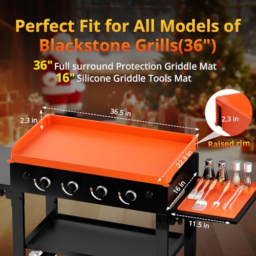 Especificaciones: Funda de silicona de 36 pulgadas y alfombrilla de parrilla de 16 pulgadas para parrilla Blackstone, cobertura completa mejorada, resistente al calor, impermeable, protección a prueba de polvo y óxido