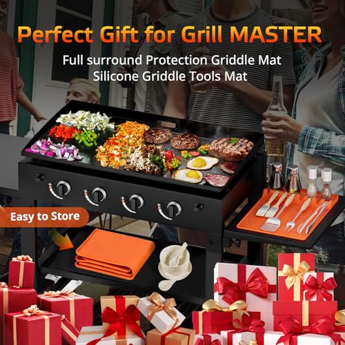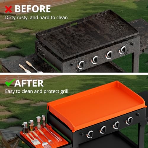 Alfombrilla de silicona mejorada de 36 pulgadas: esta alfombrilla de silicona mejorada está hecha de silicona 100% certificada de grado alimenticio y viene con accesorios de parrilla Blackstone de 16 pulgadas. La protección completa de 36 pulgadas con paredes laterales elevadas garantiza un ajuste perfecto para todos los modelos de parrilla Blackstone. Se adapta perfectamente a la superficie de la plancha para una protección completa y sin preocupaciones. Regalo perfecto para Grill Master