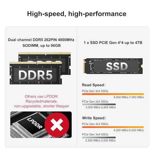 Rápido y listo para el futuro: ideal para el futuro. La mini PC A6 está construida con una unidad SSD PCIe Gen4 NVMe de 1 TB. Amplíe aún más con un SSD M.2 2242 (hasta 2 TB) para almacenar miles de fotos, canciones u horas de video HD. Experimente la multitarea sin retrasos y un verdadero rendimiento a largo plazo que crece con sus necesidades.