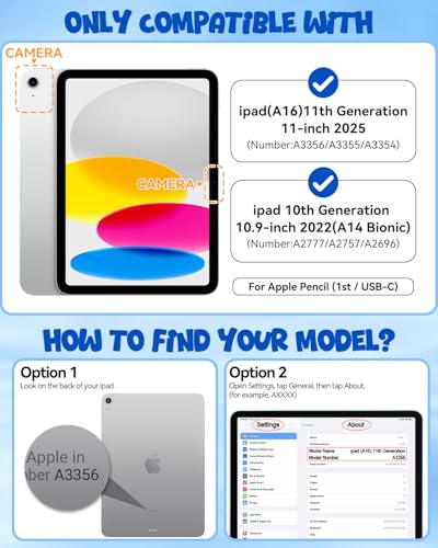 Compatibilidad: diseñado exclusivamente para iPad (A16) 11ª generación 11 pulgadas 2025/iPad 10.9 pulgadas 2022 (modelo: A3354/A3355/A3356/A2696/A2757/A2777); no compatible con ningún otro modelo; verifica el número de modelo de tu iPad en el volver antes de comprar