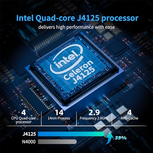 【Mini ordenador sin ventilador】Esta mini tablet está equipada con un procesador J4125 más rápido para evitar el estrangulamiento de la CPU/GPU. Es una competente mini PC de cuatro núcleos sin ventilador que cumple con las tareas diarias de negocios, familia y entretenimiento. Tiene una frecuencia base de funcionamiento de 2.0 GHz/s a 2.7GHz (4MB de caché), consume menos de 10 vatios de energía, no hace ruido y es completamente silencioso, lo que mejora la eficiencia.