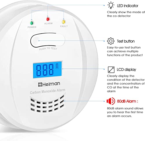 HEIMAN Detector de monóxido de Carbono, EN 50291, Alimentado por baterías de 5 años y Sensor de 10 años, Alarma CO, con Pantalla LCD-723ESY