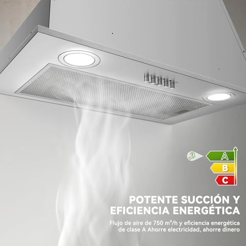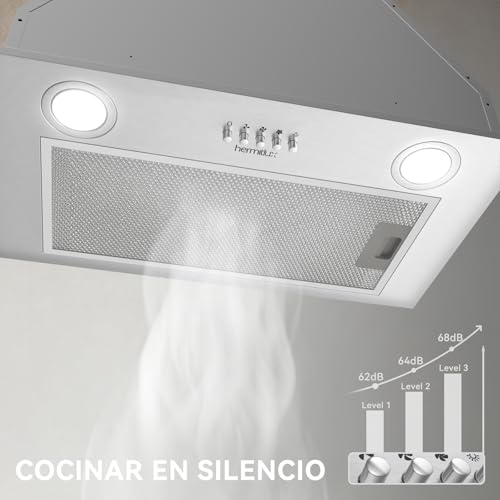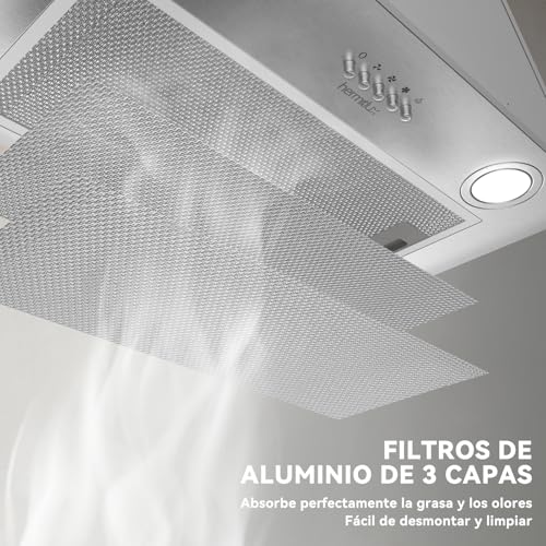 Especificaciones: Hermitlux Campana Extractora 52cm Encastrable, Extractor Cocina Flujo Aire 750m³/h, 68dB, Iluminación LED, Filtro de Carbón, Acero inoxidable