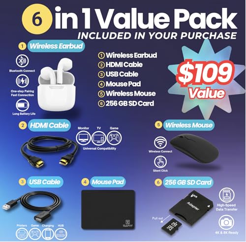 Accesorio: Hubxcel autorizado: tarjeta de almacenamiento de 256 GB, paquete de valor 5 en 1: incluye auriculares inalámbricos, alfombrilla de mouse, cable HDMI, cable USB y mouse inalámbrico).