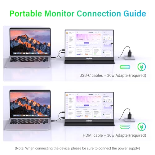 [Plug and Play] Equipado con 2 puertos tipo C con funciones completas y 1 puerto HDMI estándar, este monitor de viaje para computadora portátil no requiere instalación de controlador. Simplemente conéctese a su computadora portátil con solo dos cables para una configuración instantánea.