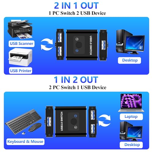 Interruptor USB bidireccional: comparte sin esfuerzo tus dispositivos USB entre dos computadoras con nuestro interruptor USB bidireccional 1 en 2 salidas/2 en 1 salida. Diseñado para mayor comodidad y eficiencia, este conmutador USB 3.0 le permite conectar un solo periférico USB a dos computadoras o cambiar entre dos dispositivos USB en una computadora. Ya sea que administre impresoras, escáneres u otros dispositivos USB, este conmutador lo hace simple y rápido.