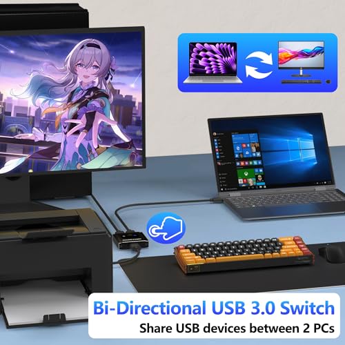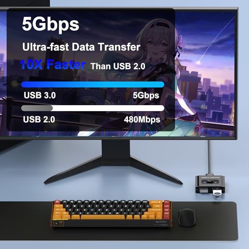【USB 3.0 de alta velocidad】Con tecnología de conmutador kvm USB 3.0, te beneficiarás de velocidades de transferencia de datos de hasta 5 Gbps, asegurando un rendimiento rápido y confiable. El conmutador también es compatible con dispositivos USB 2.0 y USB 1.1, lo que lo hace versátil para varias configuraciones. Cable USB 3.0 no incluido