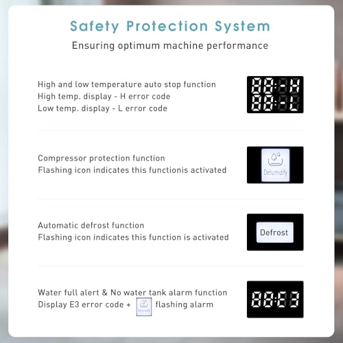 Sistema de Protección de Seguridad: Este gran deshumidificador utiliza refrigerante R290 ecológico. Cuenta con protección del compresor para evitar daños durante el arranque, protección de temperatura para evitar condiciones extremas y alertas de depósito lleno para mantener el funcionamiento normal. Además, la función de descongelamiento automático del deshumidificador portátil inteligente garantiza estabilidad a largo plazo.