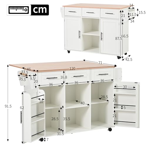 Especificaciones: Isla De Cocina Móvil con Ruedas, Carro de Cocina con Mesa de Comedor Extensible, Mueble Auxiliar de Cocina con Estantes Ajustables, Estante para Especias y 3 Cajones,139x 46-71×91,5cm (Blanco)