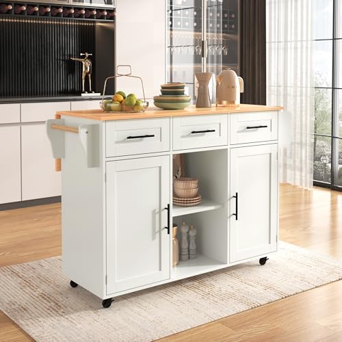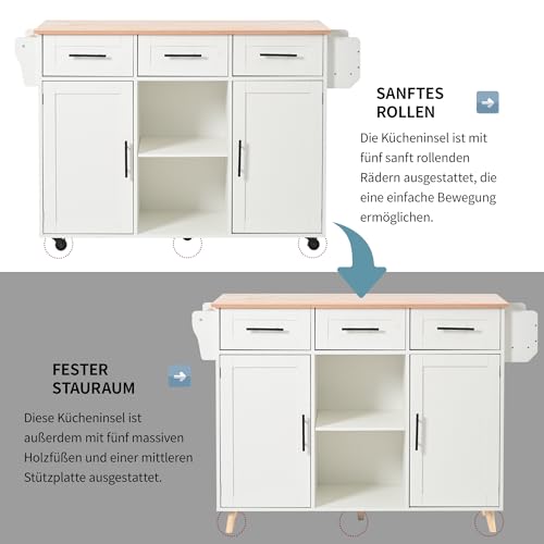 Isla De Cocina Móvil con Ruedas, Carro de Cocina con Mesa de Comedor Extensible, Mueble Auxiliar de Cocina con Estantes Ajustables, Estante para Especias y 3 Cajones,139x 46-71×91,5cm (Blanco)