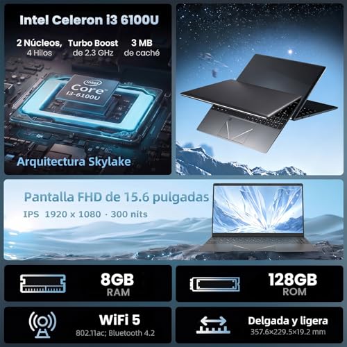 Especificaciones: Kayoote Ordenador Portátil 15.6 Pulgadas, Procesador i3-6100U Laptop Negocios, 8GB DDR3 128GB SSD PC Estudiantes, Win 11 Pro, Huella Dactilar, USB 3.0, HDMI, WiFi, BT, Teclado Retroiluminado RGB