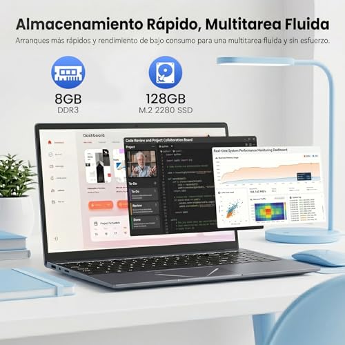 【8GB RAM y 128GB SSD para Multitarea Rápida】 Este portátil está equipado con 8GB de RAM DDR3 y un amplio SSD de 128GB, ofreciendo velocidades de arranque ultrarrápidas y gran capacidad de almacenamiento. Garantiza una multitarea fluida, permitiéndole ejecutar múltiples aplicaciones y pestañas del navegador a la vez, y acelera el inicio del software para satisfacer sus necesidades diarias de oficina.
