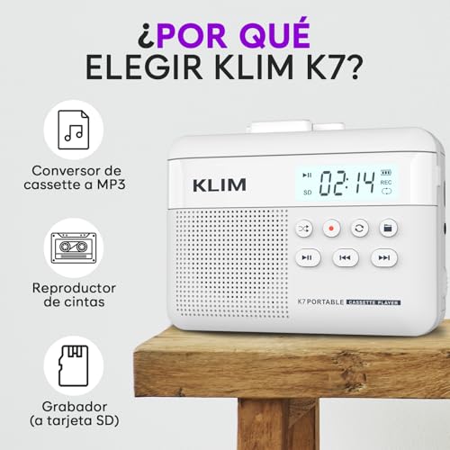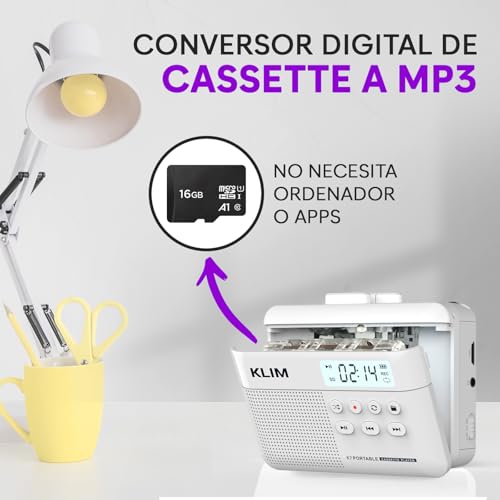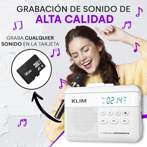 KLIM K7 Reproductor Cassette + Conversor de Cassette a MP3 + Walkman Cassette Player Portátil con Micrófono y Altavoz Integrados + BaterÃa Recargable + Auriculares + Tarjeta SD 16 GB