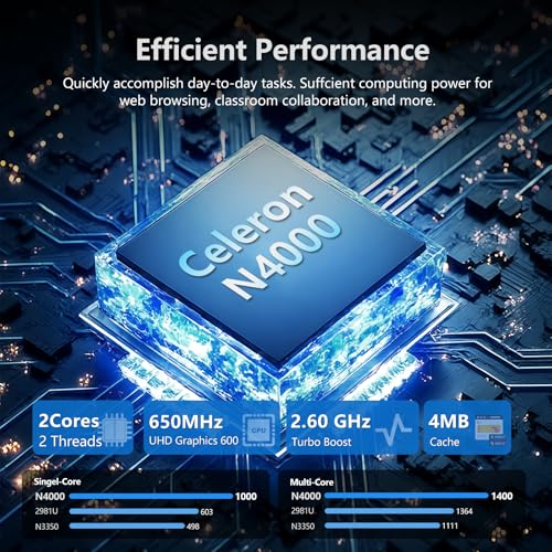 Especificaciones de rendimiento claras | Procesador Celeron N4000: cuenta con un procesador de doble núcleo con una frecuencia base de 1.1 GHz que puede escalar de forma inteligente hasta una frecuencia de ráfaga de 2.6 GHz cuando sea necesario para tareas exigentes. Perfect para L. a. productividad diaria, navegación internet y streaming.