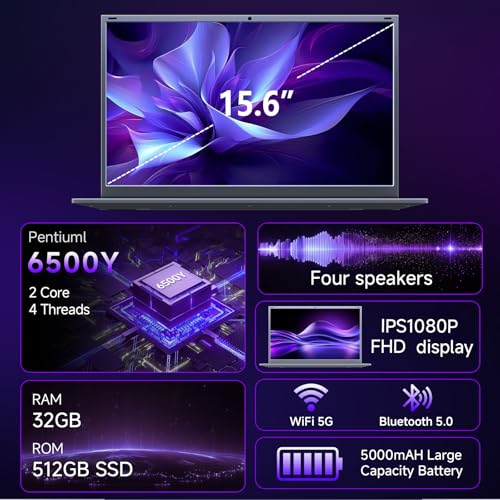 Especificaciones: Laptop de 15.6 pulgadas, 32 GB de RAM, 512 GB SSD Pentium 6500Y (hasta 3.4 GHz), pantalla IPS FHD 1080, computadora portátil Wi-Fi 5 BT 5.0, estudiante y empresa