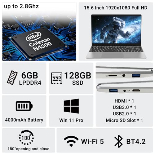 Especificaciones: Laptop empresarial Win 11 de 15.6 pulgadas, DDR4 de 6 GB SSD de 128 GB, portátiles Celeron N4500 con procesador para estudiantes, pantalla FHD de 1920 x 1080, Wi-Fi 5, BT5.0, teclado en inglés