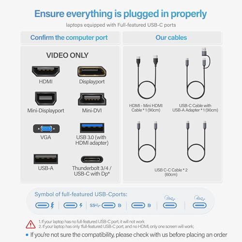 Plug and Play:laptop monitor extender seamlessly work with 12-inch – 17.5-inch laptops equipped with HDMI or full-featured USB-C ports, compatible with Windows, Android, and MacOS (M1/M2/M3 Pro/Max only; Excluding the basic M1/M2/M3 chips, Chromebook, Surface, Linux, Switch, X-box and PS-4. For MacBook users 1 USB-C cable connetion M1/M2/M3/M4 base models only mirror 1 screen