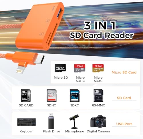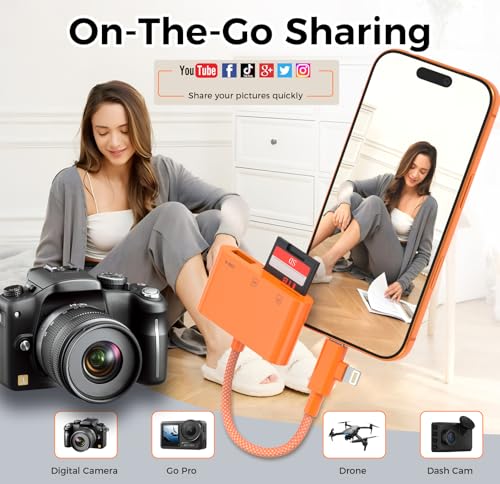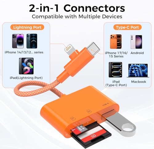 [Naranja vibrante: el estilo se une a la visibilidad] Destaca con nuestro diseño característico «naranja de seguridad». Este no es solo un lector básico de tarjetas de cámara; es un utensilio tecnológico de moda que es fácil de encontrar en tu bolsa de equipo o césped alto. La construcción compacta y portátil lo convierte en un adaptador de fotos imprescindible para iPhone para cualquier aventura. Disfruta de una experiencia de tarjeta SD a iPhone que se ve tan nítida como funciona. Elegante, duradero y construido para tu estilo de vida digital moderno.