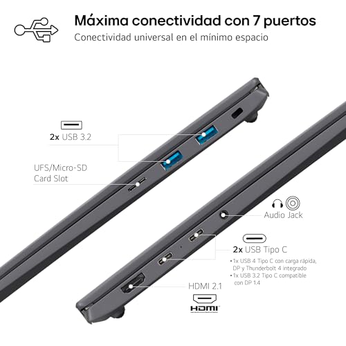 Alta conectividad con 7 puertos (2 x USB 3.2, 2x USB Tipo C con Thunderbolt 4 integrado para carga ultrarrápida, HDMI 2.1, ranura para Micro SD 3.0 y entrada de auriculares).