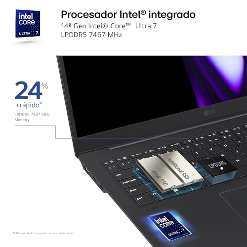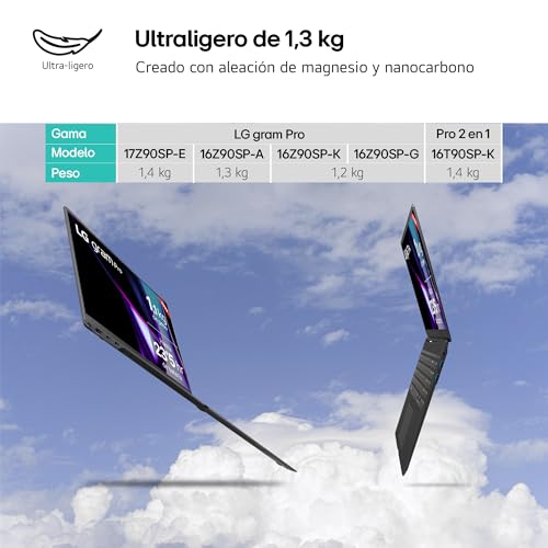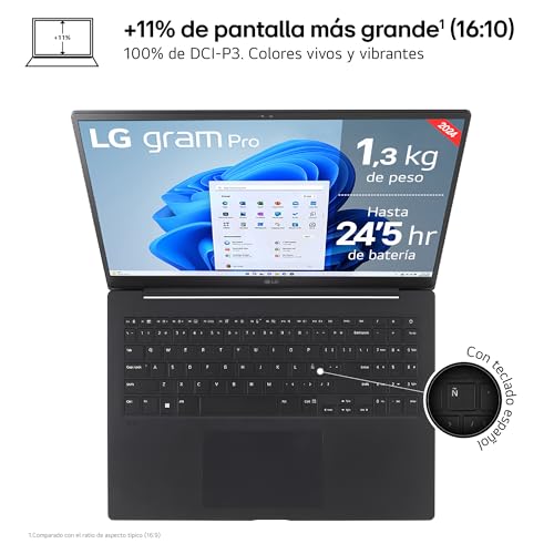 LG gram Pro 16Z90SP-A.AD88B – Portátil Ultraligero de 40.6 cm (16″), OLED, Intel Core Ultra 7, 32 GB RAM, 1TB SSD, batería hasta 24.5 h, 1,2kg, NVIDIA RTX3050, W11 Home, Negro, Teclado QWERTY Español