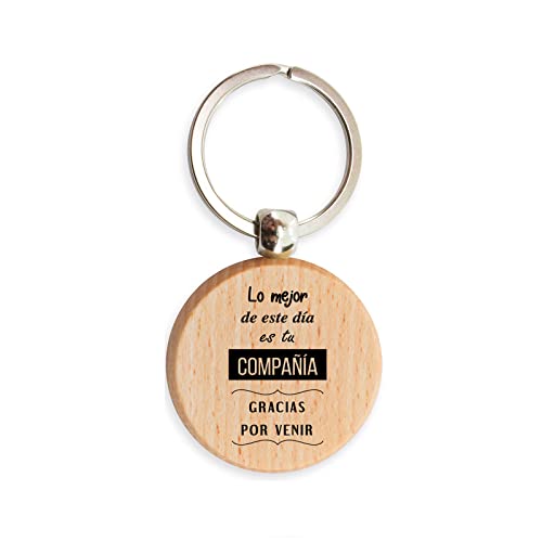 Llavero circular de madera «Lo mejor de este día es tu compañía». Original detalle para regalar a invitados de cumpleaños, bodas, bautizos, comuniones etc.