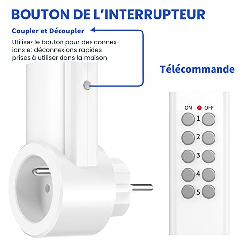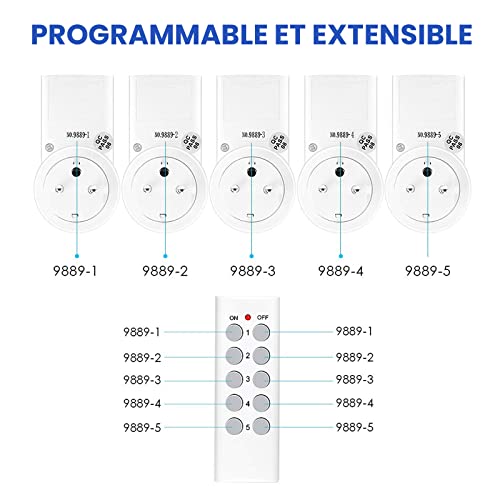 Lote de 5 Toma teledirigido programable, Toma domótica inalámbrica , Función All on/All Off , Dos Mandos y Dos Pilas Incluidas