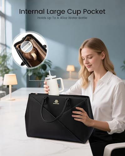 Soporte interior para tazas grande: la bolsa para laptop Lovevook para mujer cuenta con un bolsillo interior que puede contener una botella de agua de 40 onzas y se ajusta perfectamente sobre el asa para mantener la botella en posición vertical y evitar derrames. Combinando funcionalidad y estilo, es perfecto para viajes largos o reuniones durante todo el día.