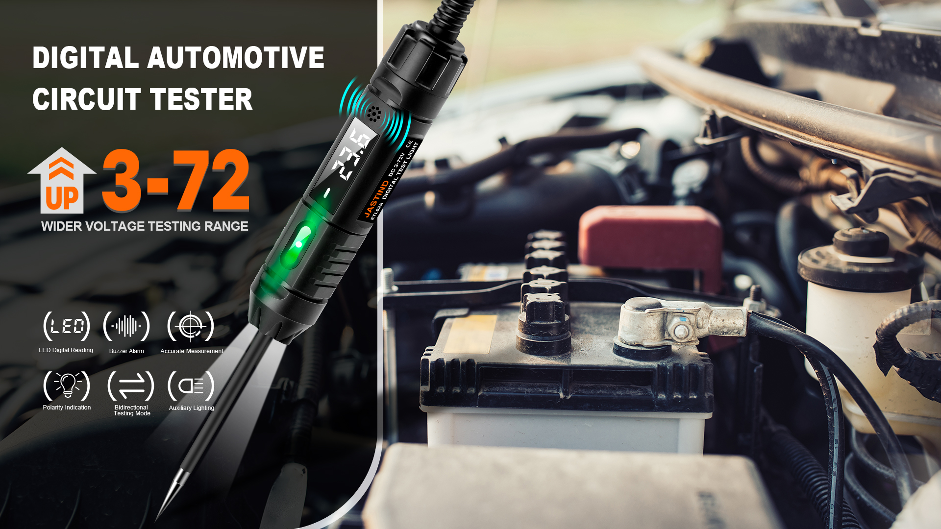 Rango de prueba más amplio de 3 a 72 V: la luz de prueba automotriz de alta calidad JASTIND se actualiza a un rango de prueba de voltaje de 3-72 V, más ancha que la mayoría de las luces de prueba del mercado. Este probador de circuito automático es ideal para comprobar los circuitos eléctricos de varios vehículos, como faros de automóviles, luces traseras, fusibles, baterías de automóviles, etc. También se puede utilizar para medir otros sistemas de circuito de 3-72V CC.