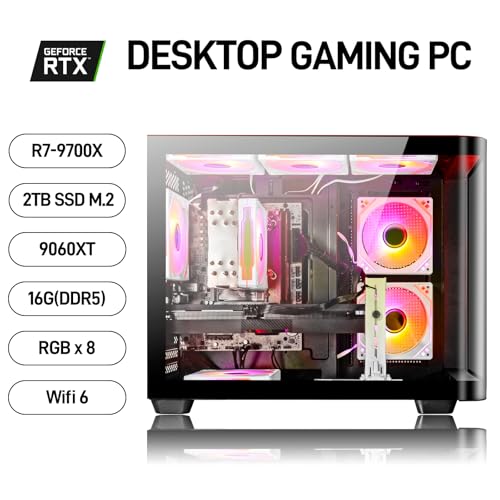 LXZ Computadora de escritorio para juegos Ryzen 7 9700X, Radeon RX 9060 XT 16GB, 32 GB DDR5 RAM, SSD NVMe 4.0 de 2 TB, PSU de 850 W, lista para juegos, realidad virtual y transmisión de 1440p y 4K