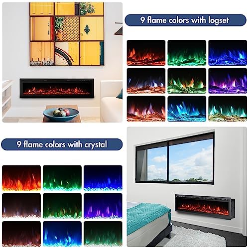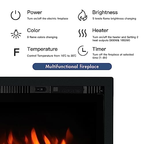 🔥Mando a distancia y control de pantalla táctil: Es más conveniente controlar cada función de la chimenea eléctrica de pared: Interruptor de encendido, ajustes del temporizador (1-8h), color de la llama (9 colores), regulador de la llama (5 niveles de brillo), control del termostato (16℃-28℃) y 3 ajustes de calor (calefacción apagada y 900W y 1800W).