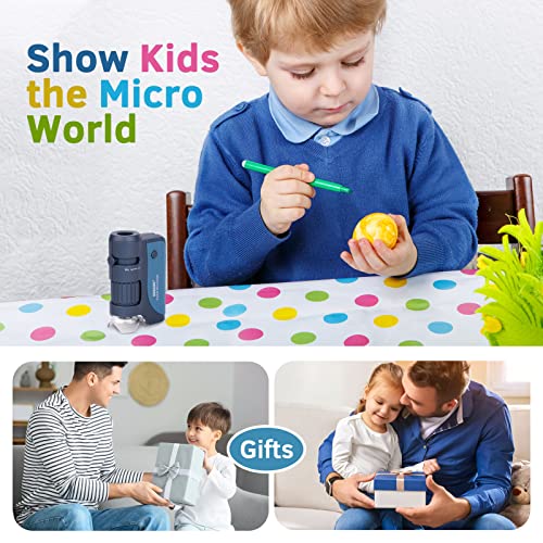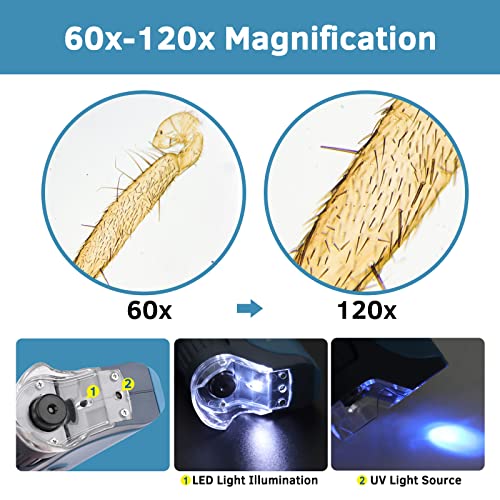 Microscopio de Bolsillo 60x-120x, Mini microscopio de Mano con Zoom Iluminado por LED, 5 portaobjetos preparados, microscopio portátil para niños Estudiantes observación microbiológica Estudio