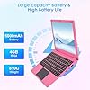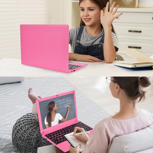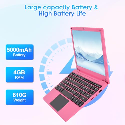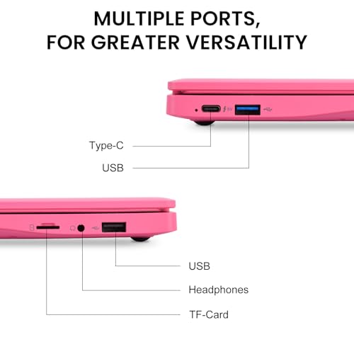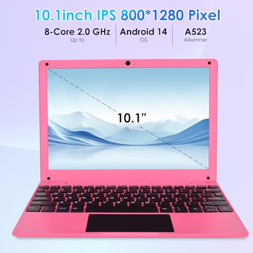 Especificaciones: Mini computadora portátil, Android 13 de 10.1 pulgadas, 4 GB de RAM, 128 GB de almacenamiento, pantalla IPS HD, píxeles de 1280 x 800, netbook portátil con CPU Allwinner A523 color rosa