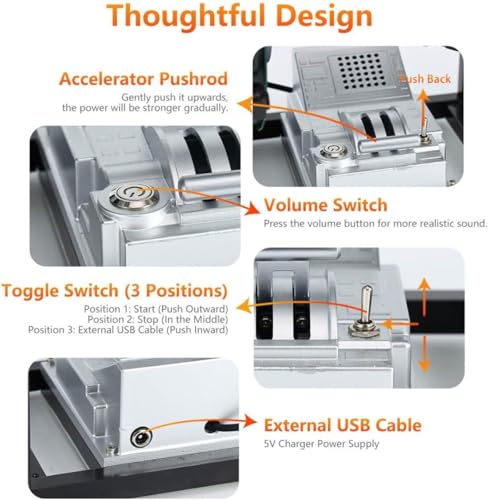 La caja del motor ahuecada permite que el funcionamiento de un motor real a través de la funcionalidad accionada por el motor sea completamente visible. Equipado con con un soporte fijo, palanca del acelerador y módulo de sonido del motor, que proporciona una experiencia más realista y atractiva, sumergiéndolo en el fascinante mundo de la maquinaria industrial